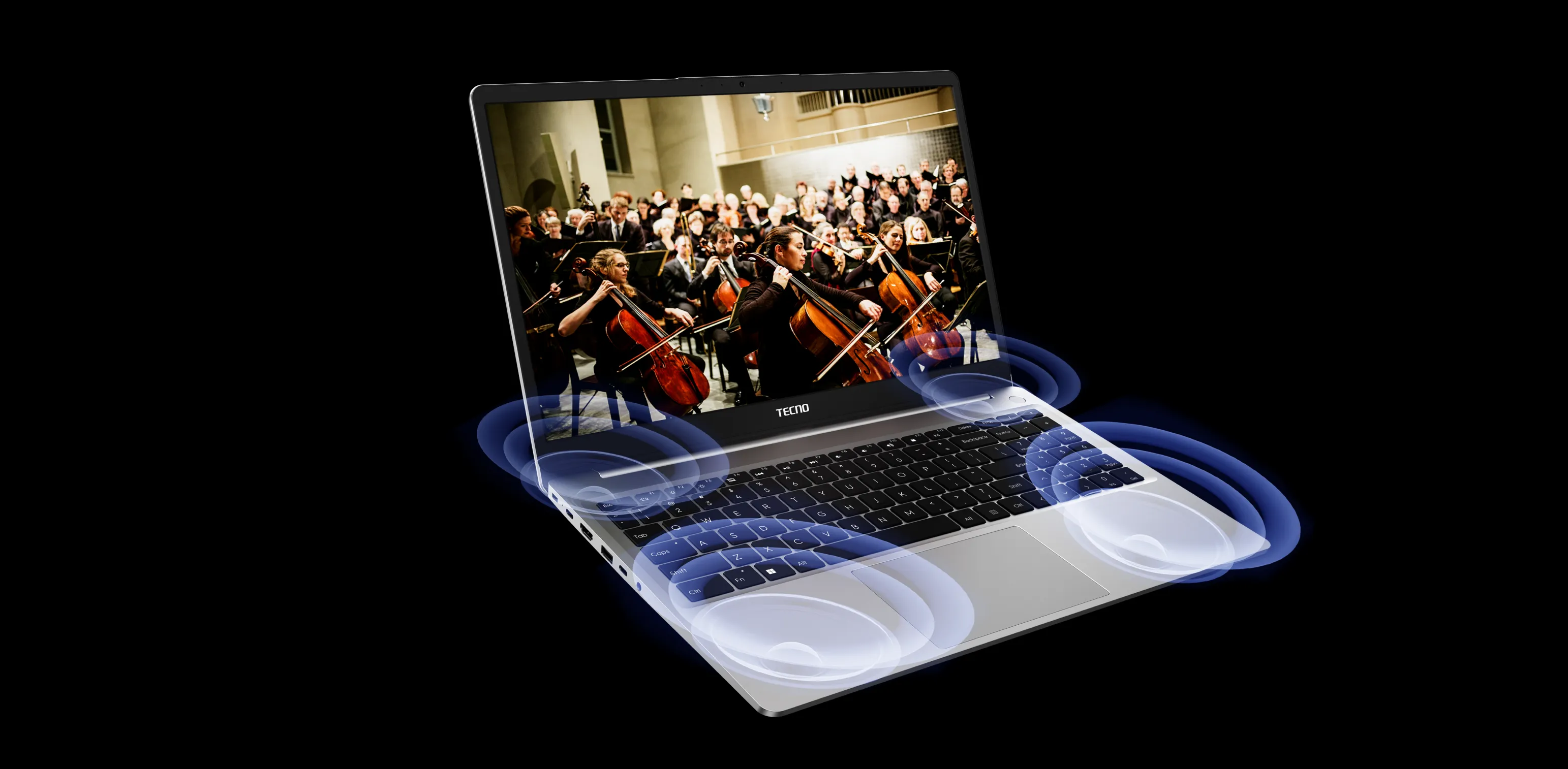 Tecno Megabook K15S поддерживает технологию DTS, благодаря чему звук становится объёмным и чистым. Просмотр фильмов или прослушивание музыки превращается в приятный опыт без необходимости подключения внешней акустики.