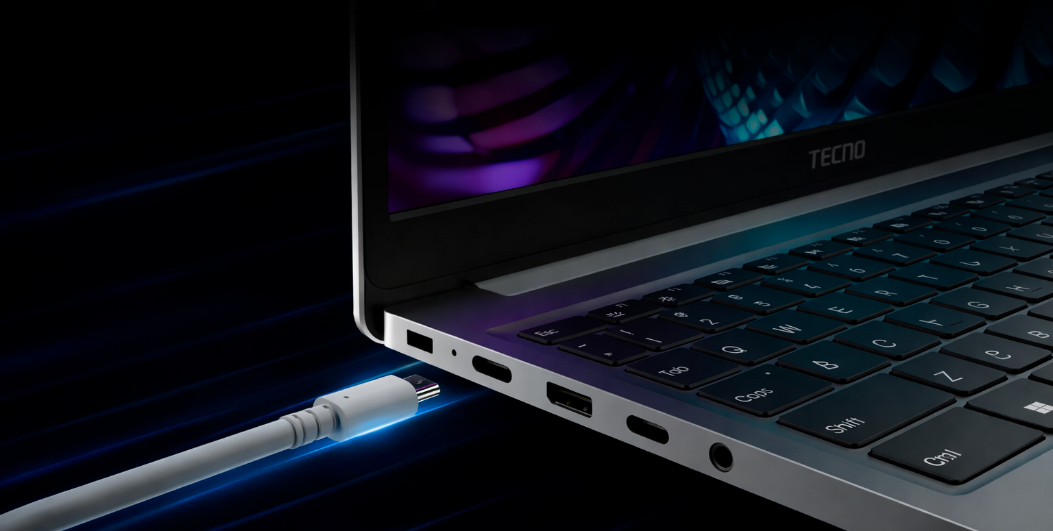 Tecno Megabook K15SFA поддерживает Wi-Fi 802.11ax и Bluetooth 5.4, что обеспечивает современный уровень беспроводного подключения. Для периферии и внешних устройств предусмотрены два порта USB 3.x, два USB Type-C, HDMI и комбинированный аудиоразъем 3.5 мм. Такой набор делает ноутбук удобным для подключения монитора, накопителей, аксессуаров и другой техники.