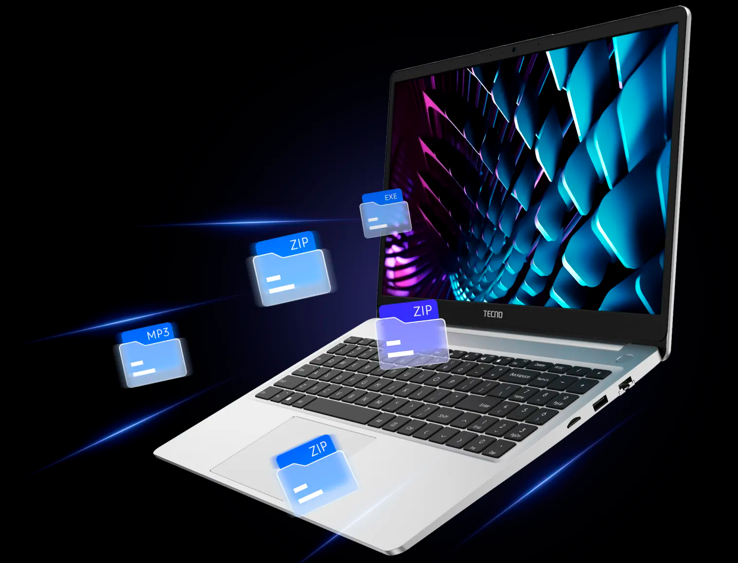 Tecno Megabook K15SFA выполнен в серебристом алюминиевом корпусе и сочетает сдержанный деловой стиль с практичностью на каждый день. Ноутбук выглядит аккуратно и современно, а благодаря толщине 17.3 мм и весу 1.58 кг его удобно брать с собой на работу, учебу или в поездки. Полноразмерная клавиатура с цифровым блоком делает модель особенно удобной для тех, кто часто работает с таблицами, документами и числами.
