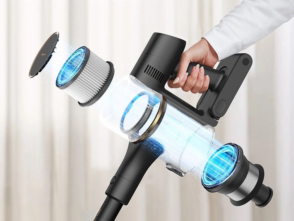 Эффективность уборки достигается благодаря высокоскоростному бесщеточному двигателю, обеспечивающему мощность всасывания 150 аэроватт (20000 Па) и надежное удаление волос, грязи, пыли и мелкого мусора.