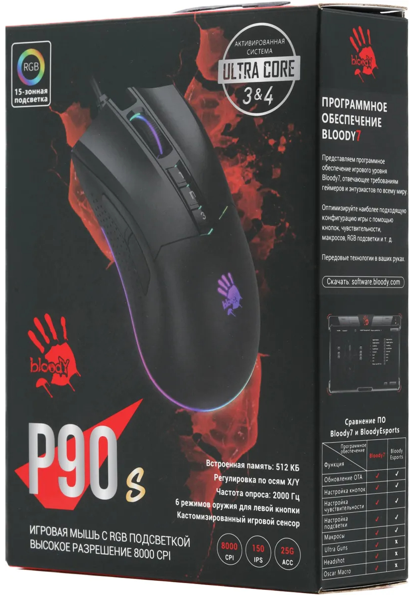 Классический черный цвет корпуса дополняет RGB-подсветка, которая настраивается для создания уникального дизайна. Прорезиненное колесо прокрутки порадует долговечностью и приятными ощущениями при касании. Форма корпуса мыши A4Tech Bloody P90s оптимизирована для управления правой рукой.