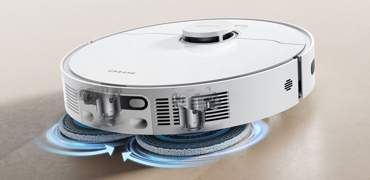 Система DuoScrub использует две вращающиеся швабры, которые очищают пол под давлением, эффективно справляясь со стойкими загрязнениями. Благодаря технологии RoboSwing швабры автоматически поднимаются при наезде на ковёр, предотвращая его намокание. Такой подход делает уборку точной и безопасной для любых покрытий.