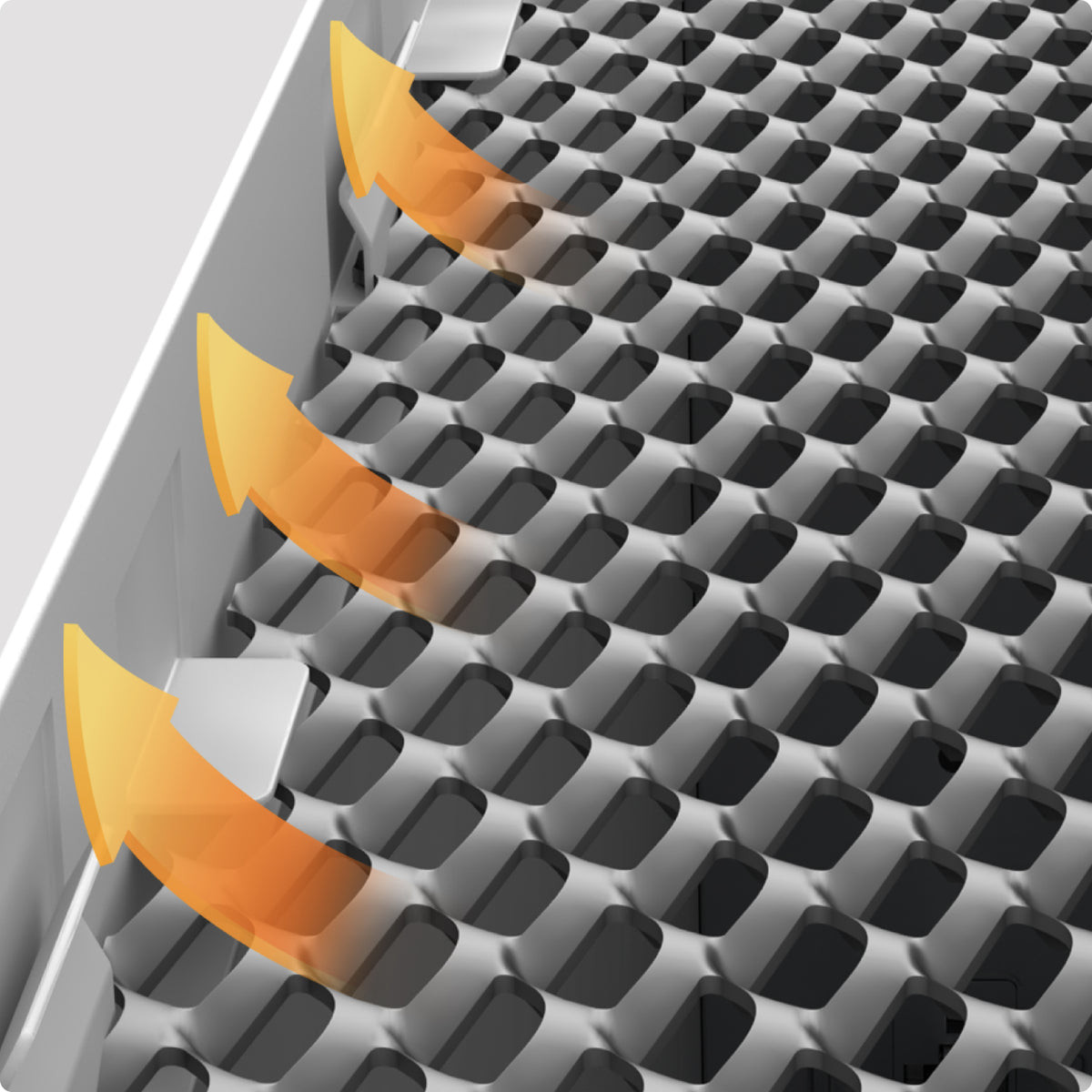 Эффективная конструкция с 72 алюминиевыми пластинами передает и рассеивает тепло через поверхность площадью 4 600 см², а ребристая структура создает более организованный поток воздуха. Благодаря высокой мощности 2200 Вт помещение прогревается еще быстрее.